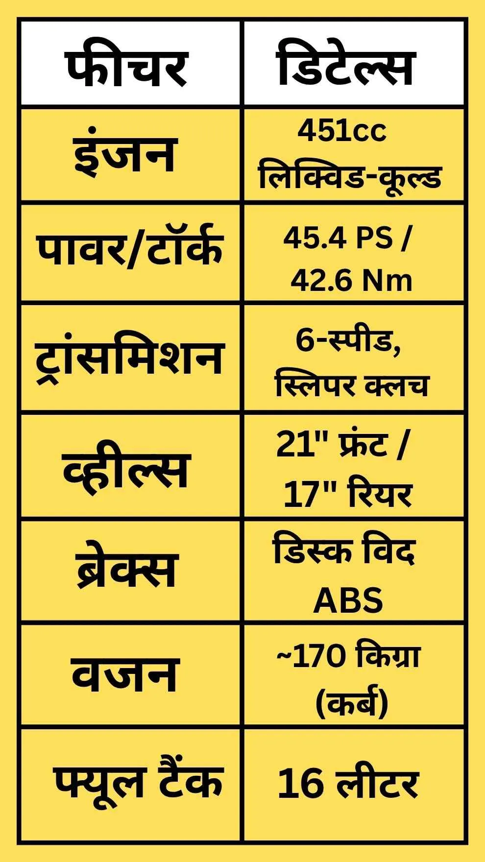 451cc ट्विन का दमदार पावरइसकी जान है 451cc लिक्विड-कूल्ड पैरेलल ट्विन इंजन, जो निंजा 500, Z500 और एलिमिनेटर 500 से लिया गया है. यह लगभग 45.4 PS पावर और 42.6 Nm टॉर्क जेनरेट करता है, लेकिन एडवेंचर ट्यूनिंग के साथ लो-एंड टॉर्क बेहतर मिलेगा. 6-स्पीड गियरबॉक्स में बड़े सप्रोकेट्स लगे हैं, जो ऑफ-रोड पर बेहतर ग्रिप देंगे. इंजन को फ्रेम का स्ट्रेस्ड मेंबर बनाया गया है, जो सेंटर ऑफ ग्रेविटी को नीचा रखता है. माइलेज 45-55 किमी/लीटर की उम्मीद है.