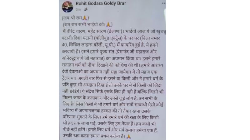 धमकी देते हुए पोस्ट में लिखा गया है, “जय श्री राम, राम राम सभी भाईयो को. मैं वीरेन्द्र चारण, महेन्द्र सारण (डेलाणा). भाइयों आज ये जो खुशबू पाटनी, दिशा पाटनी की बहन के घर पर फायरिंग हुई है, ये हमने करवाई है. इसने हमारे पूज्य संत प्रेमानंद जी महाराज और अनिरुद्धाचार्य जी महाराज का अपमान किया था. इसने हमारे सनातन धर्म को नीचा दिखाने की कोशिश की थी. हमारे आराध्य देवी देवताओं का अपमान नहीं सहा जायेगा. ये तो महज एक ट्रेलर था. अगली बार फिर से इसने या किसी और ने हमारे धर्म के प्रति कुछ भी अभद्रता दिखाई तो उनके घर में से किसी को जिंदा नहीं छोड़ेंगे.'