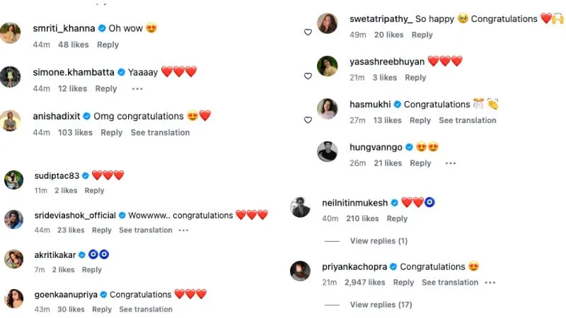 प्रेग्नेंसी की खबर सामने आते ही सोशल मीडिया पर बधाई का तांता लग गया है. बॉलीवुड सेलेब्स और एक्ट्रेस को चाहने वाले उन्हें दिल खोलकर बधाई दे रहे हैं. एक्ट्रेस समांथा रुथ प्रभु ने ढेर सारे दिल कमेंट में पोस्ट किए हैं, जबकि यश देसाई ने दुआ को बड़ी बहन बनने की बधाई दी है.