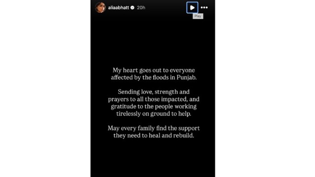 इसके साथ ही एक्ट्रेस आलिया भट्ट ने भी बाढ़ पीड़ितों के साथ अपनी संवेदनाएं व्यक्त की. उन्होंने अपनी इंस्टा स्टोरी में लिखा, "पंजाब में बाढ़ से प्रभावित सभी लोगों के प्रति मेरी संवेदना है. मैं प्रभावित सभी लोगों के लिए प्यार, शक्ति और प्रार्थनाएं भेज रही हूं, और जमीनी स्तर पर लोगों की मदद में जुटे लोगों का आभार व्यक्त करती हूं. ईश्वर करे कि हर परिवार को वह सहारा मिले, जिसकी उन्हें जरूरत है ताकि वे उबर सकें और फिर से खड़े हो सकें.”