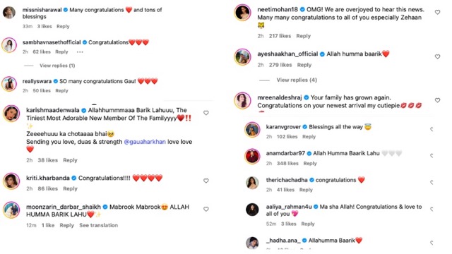 सिंगर नीति मोहन ने कमेंट में लिखा, ''ओह माई गॉड! यह न्यूज सुनकर हमें बहुत खुशी हुई. आप सभी को, खासकर जेहान को ढेर सारी बधाइयां.’’ 'रोडीज एक्सट्रीम' के विजेता कशिश ठाकुर पुंदीर, एक्ट्रेस अमायरा दस्तूर, कृति खरबंदा, दीया मिर्जा, समीरा रेड्डी, सोफी चौधरी, तनाज ईरानी और कमडियन सुगंधा मिश्रा ने कमेंट्स में बधाई दी.