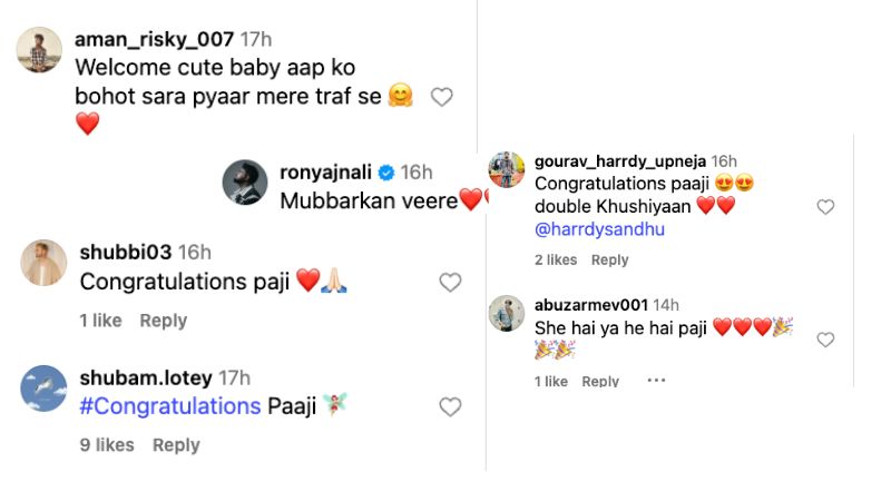 जैसे ही हार्डी ने बच्चे के आगमन की घोषणा की, उसके बाद से ही सोशल मीडिया पर हलचल तेज हो गई है कि हार्डी के घर बेटा आया है या बेटी, फ़िलहाल सिंगर ने ख़ुद भी इसका खुलासा नहीं किया है. हालांकि फैंस ने कमेंट सेक्शन में उन्हें और उनके परिवार को शुभकामनाएँ देना शुरु कर दिया है. एक यूजर ने लिखा, "मुबारका वीरें.