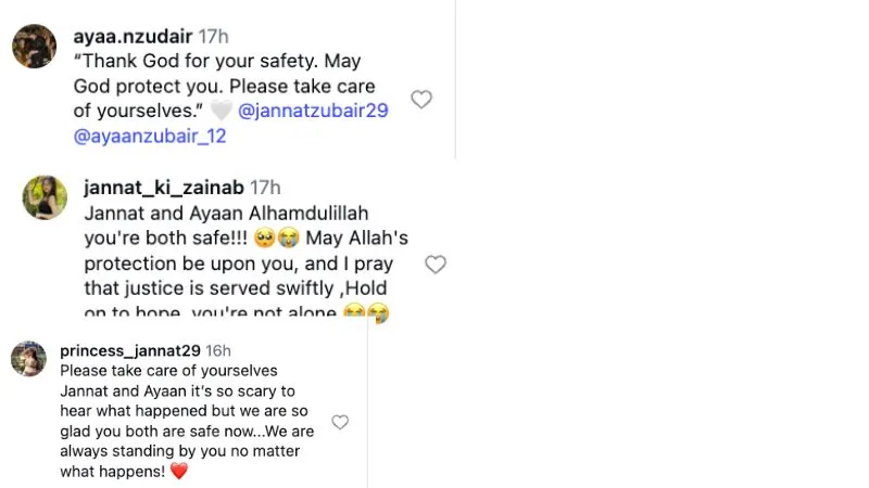 इस घटना की खबर सुनकर सोशल मीडिया पर फैंस के बीच हड़कंप मच गया. कई यूजर्स ने चिंता जताते हुए उनकी सलामती की प्रार्थना और दोनों की सुरक्षा की दुआएं मांगीं. एक फैन ने लिखा, “जन्नत और अयान, अल्हम्दुलिल्लाह, आप दोनों सुरक्षित हैं!!! अल्लाह की हिफ़ाज़त आप पर बनी रहे, और मैं दुआ करता हूँ कि आपको जल्द से जल्द इंसाफ़ मिले. उम्मीद मत छोड़ना, आप अकेले नहीं हैं.”