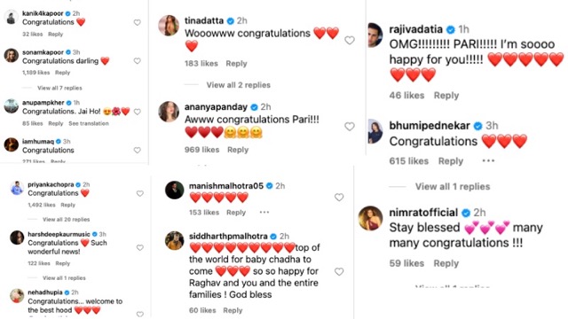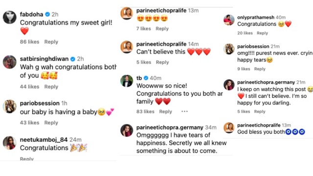 परिणीति के इस पोस्ट पर उनके फैंस और दोस्तों ने अपनी-अपनी प्रतिक्रियाएं दीं. सबसे पहले तो उनकी करीबी दोस्त और बॉलीवुड की मशहूर अभिनेत्री भूमि पेडनेकर ने इस पोस्ट पर बधाई देते हुए कमेंट किया. इसके अलावा बहन प्रियंका चोपड़ा ने भी उन्हें बधाई दी. इसके अलावा सोनम कपूर, अनन्या पांडे, नेहा धूपिया, कैटरीना कैफ़, अनुपम खेर समेत कई हस्तियों ने बधाई दी है.