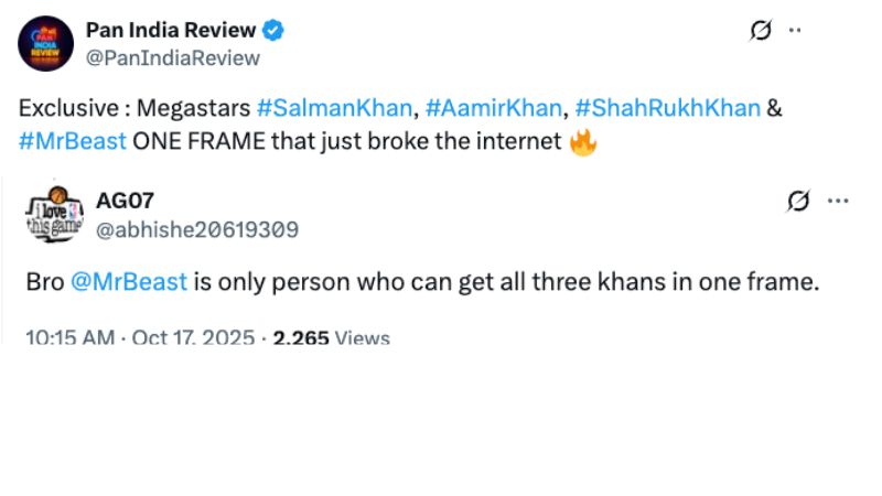 वहीं एक दूसरे यूजर ने लिखा, मेगास्टार सलमान खान, आमिर खान, शाहरुख खान और मिस्टर बीस्ट एक फ्रेम में, जिसने इंटरनेट पर धूम मचा दी.”