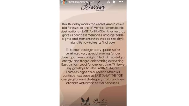 शिल्पा शेट्टी ने अपनी इंस्टाग्राम स्टोरी पर लिखा, "इस गुरुवार को एक युग का अंत हो रहा है क्योंकि हम मुंबई के सबसे प्रतिष्ठित स्थलों में से एक - बास्टियन बांद्रा को अलविदा कह रहे हैं. एक ऐसा स्थल जिसने हमें अनगिनत यादें, अविस्मरणीय रातें और ऐसे पल दिए जिन्होंने शहर की नाइटलाइफ़ को आकार दिया, अब अपना अंतिम प्रणाम कर रहा है."