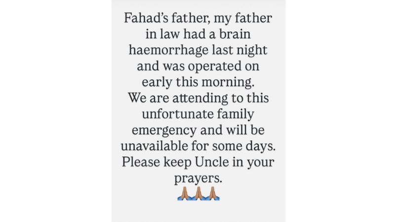 पोस्ट के आखिर में स्वार ने हाथ जोड़ने वाली इमोजी का भी इस्तेमाल किया. इंस्टाग्राम पोस्ट के कैप्शन में उन्होंने लिखा, ''कृपया मेरे ससुर जी के लिए प्रार्थना करें.’’