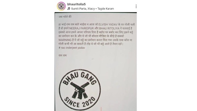 गैंग के दो बदमाशों नीरज फरीदपुरिया और भाऊ रिटोलिया ने सोशल मीडिया पर एक पोस्ट डाला, जिसमें लिखा, "जय भोले की हां भाई राम राम सारे भाईया न आज जो ELVISH YADAV के घर गोली चली है वो हमने NEERAJ FARIDPUR और BHAU RITOLIYA ने चलवाई है इसको आज हमने अपना परिचय दिया है बहोत घर बर्बाद कर लिए इसने सट्टे का प्रमोशन कर के और ये जो भी सोशल मीडिया के कीड़े है सबको WARNING है ये जो सट्टे का प्रमोशन करता मिल गया उसके पास कॉल या गोली कभी भी आ सकती है तोह ये जो भी सट्टे आले है तैयार रहो. #raoinderjeet yadav राम राम