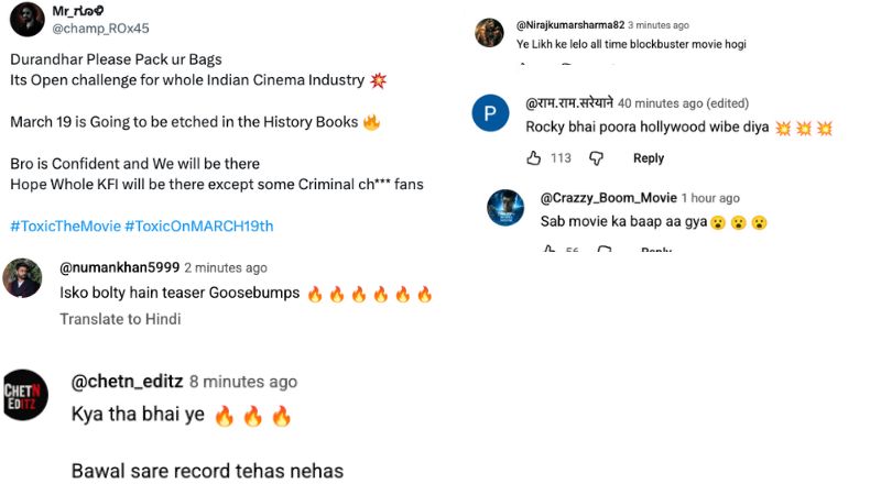 टॉक्सिक का टीजर सोशल मीडिया पर ट्रेंड कर रहा है, यश का अंदाज देख लोग हैरान रह गए हैं, और जमकर टीज़र की तारीफ कर रहे हैं. कुछ ने धुरंधर को अपना बैग पैक करने की सलाह दे दी है. एक यूजर ने लिखा, “धुरंधर, प्लीज़ अपना बैग पैक कर लो. यह पूरी इंडियन सिनेमा इंडस्ट्री के लिए ओपन चैलेंज है. 19 मार्च इतिहास की किताबों में दर्ज होने वाला है.”