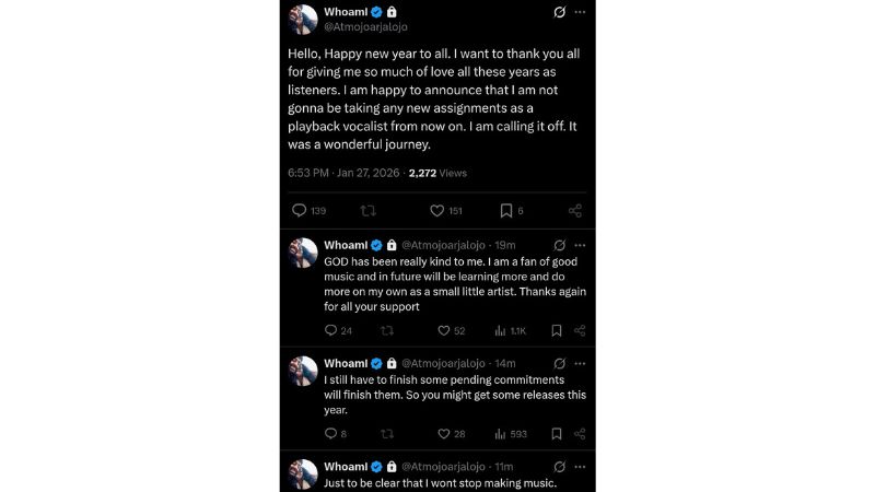 अरिजीत सिंह ने ये भी क्लीयर किया है की वो प्लेबैक सिंगिंग से रिटायरमेंट ले रहे हैं, लेकिन म्यूज़िक बनाना बंद नहीं करेंगे. अरिजीत ने लिखा, 'मैं सचमुच बहुत भाग्यशाली हूं. मैं अच्छे म्यूजिक का फैन हूं और भविष्य में एक छोटे कलाकार के रूप में और अधिक सीखने पर ध्यान दूंगा. आप सभी के सपोर्ट के लिए एक बार फिर धन्यवाद. मेरे कुछ अभी भी अधूरे काम बाकी हैं, और मैं उन्हें पूरा करूंगा. इसलिए, हो सकता है कि आपको इस साल मेरे कुछ गाने रिलीज देखने को मिलें. लेकिन मैं क्लियर करना चाहता हूं कि म्यूजिक बनाना बंद नहीं करूंगा.’