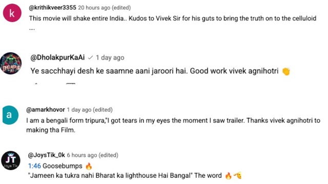 वहीं एक दूसरे यूजर ने लिखा, “मैं त्रिपुरा से बंगाली हूँ, ट्रेलर देखते ही मेरी आँखों में आँसू आ गए. विवेक अग्निहोत्री को इस फ़िल्म को बनाने के लिए धन्यवाद.”