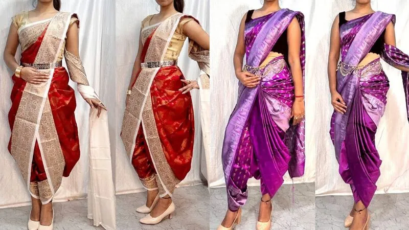 मॉडर्न इंडियन फ्यूजन लुकधोती स्टाइल साड़ी इन दिनों बहुत पॉपुलर है. इसमें साड़ी को पैंट की तरह लपेटा जाता है, जो आपको एक फ्यूजन लुक देता है. साड़ी का एक सिरा कमर पर बांधें, फिर पैरों के बीच से लपेटकर आगे लाएं. ऊपरी हिस्से को प्लेट्स बनाकर कंधे पर रखें. ये स्टाइल पार्टी या पूजा के लिए परफेक्ट है. सिल्क या कॉटन साड़ी चुनें, और मैचिंग ब्लाउज पहनें. आप स्लिम और स्टाइलिश लगेंगी.