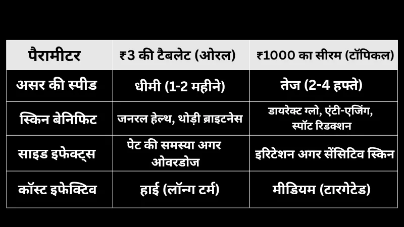 एक्सपर्ट्स चेतावनी देते हैं: "ओवरयूज से रेडनेस हो सकती है, इसलिए 3-4 बूंदें काफी. " और हां, टैबलेट्स से स्किन प्रॉब्लम्स सॉल्व नहीं होंगी अगर डाइट बैलेंस्ड न हो. कुल मिलाकर, अगर स्किन ग्लो आपकी प्रायोरिटी है, तो ₹1000 का सीरम ही बेस्ट बेट है. लेकिन डॉक्टर से कंसल्ट जरूर करें. ये स्टोरी हालिया रिसर्च और एक्सपर्ट वीडियोज पर बेस्ड है.
