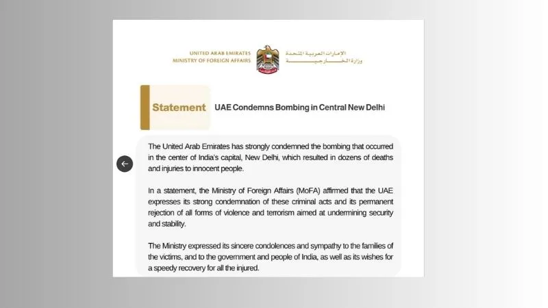 संयुक्त अरब अमीरात के विदेश मंत्रालय ने दिल्ली में ब्लास्ट की निंदा करते हुए कहा कि वह इन आपराधिक कृत्यों की कड़ी निंदा करता है और सुरक्षा एवं स्थिरता को कमजोर करने के उद्देश्य से की जाने वाली सभी तरह की हिंसा और आतंकवाद को स्थायी रूप से अस्वीकार करता है. पीड़ितों के परिवारों, भारत सरकार और जनता के प्रति गहरी संवेदना और सहानुभूति व्यक्त करता है.