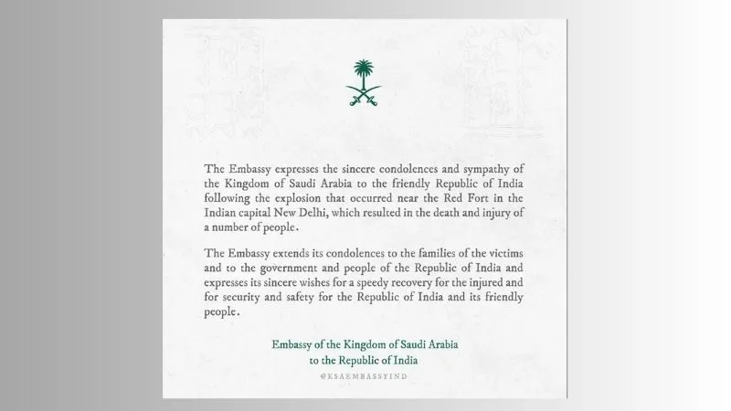 नई दिल्ली में मौजूद सऊदी अरब दूतावास की तरफ से भी आतंकी हमले की सख्त निंदा की गई. दूतावास ने अपने एक्स हैंडल पर लिखा, किंगडम दोस्त भारत के प्रति गहरी संवेदना और सहानुभूति व्यक्त करता है. दूतावास पीड़ितों के परिवारों, भारत गणराज्य की सरकार और जनता के प्रति संवेदना व्यक्त करता है.