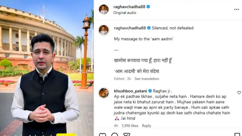 इस फैसले के बाद राघव चड्ढा ने सोशल मीडिया पर एक वीडियो शेयर किया, जिसमें उन्होंने काफी भावुक और मजबूत अंदाज में अपनी बात रखी. उन्होंने कहा कि उन्होंने हमेशा आम लोगों की आवाज उठाई है और संसद में उनके मुद्दों को रखा है. उन्होंने यह भी कहा कि अगर किसी ने उनकी आवाज को दबाने की कोशिश की है, तो इसे उनकी हार ना समझा जाए. उन्होंने कहा कि - “मैं एक नदी हूं, जो समय आने पर बाढ़ भी बन सकती है.” वीडियो के कैप्शन में उन्होंने लिखा - “Silenced, not defeated” यानी “चुप कराया गया है, लेकिन मैं हारा नहीं हूं.”
