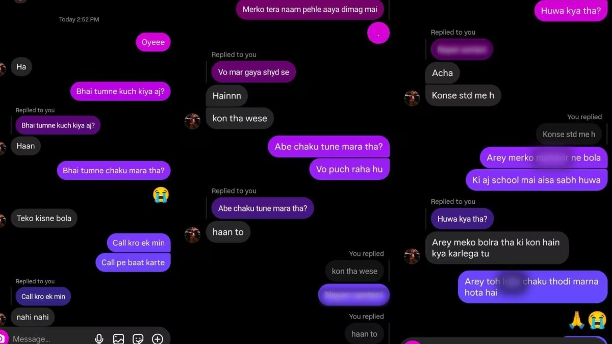 सोशल मीडिया प्लेटफॉर्म इंस्टाग्राम पर आरोपी दोस्त ने 10वीं के छात्र की हत्या की बात कबूली है. दोस्त ने उससे पूछा कि क्या तुमने सच में उसे मार डाला, जिसपर आरोपी ने रिप्लाई किया, "हां तो". चैट में उसने मरने वाले बच्चे का नाम भी लिया है.