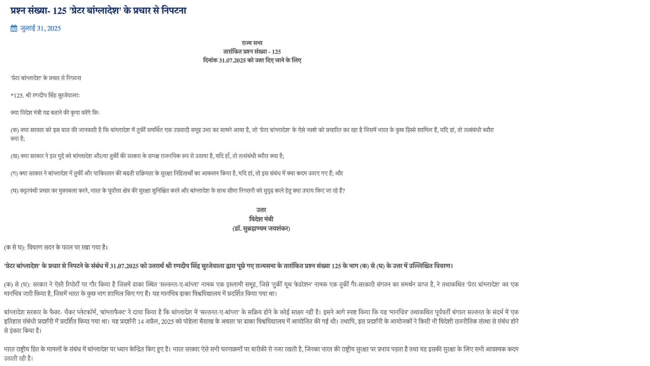 कांग्रेस सांसद रणदीप सिंह सुरजेवाला के सवाल के जवाब में एक लिखित बयान देते हुए विदेश मंत्री एस जयशंकर ने राज्यसभा में माना और जानकारी दी कि विचाराधीन नक्शा ढाका यूनिवर्सिटी में प्रदर्शित किया गया था. विदेश मंत्री ने अपने बयान में साफ कर दिया कि सरकार भारत की राष्ट्रीय सुरक्षा पर प्रभाव डालने वाले बांग्लादेश सहित तमाम घटनाक्रमों पर बारीकी से नजर रख रही है. साथ ही इसके लिए सुरक्षा के लिए सभी आवश्यक उपाय कर रही है.