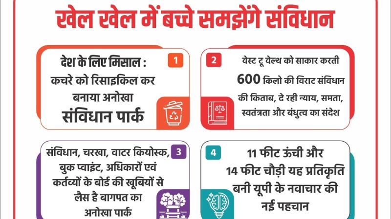 यह पार्क सिर्फ हरियाली या टहलने की जगह नहीं, बल्कि एक ओपन क्लासरूम और स्ट्रीट लाइब्रेरी के रूप में विकसित किया गया है. न्याय, समता, स्वतंत्रता और बंधुत्व जैसे संविधान के मूल आदर्शों को प्रतीकों, बोर्डों और संरचनाओं के माध्यम से इस तरह प्रस्तुत किया गया है कि हर आयु वर्ग का व्यक्ति सहजता से उनसे जुड़ सके. बच्चों के लिए यह पार्क सीखने का आनंददायक माध्यम बन गया है, जहां पढ़ाई बोझ नहीं, अनुभव बन जाती है. संविधान पार्क की सबसे बड़ी विशेषता यहां स्थापित 600 किलोग्राम की संविधान की किताब की विराट प्रतिकृति है. 11 फीट ऊंची और 14 फीट चौड़ी यह प्रतिकृति न केवल आकार में भव्य है, बल्कि अपने संदेश में भी अत्यंत प्रभावशाली है. संविधान की मूल प्रस्तावना की प्रतिकृति बड़ौत नगर पालिका में स्थापित की गई है. इसका लोकार्पण राज्य मंत्री केपी मलिक और जिलाधिकारी अस्मिता लाल ने किया है.