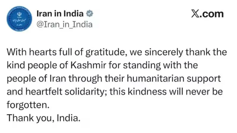 भारत से मिल रहे इस भारी समर्थन को देखते हुए, ईरानी दूतावास ने अपने आधिकारिक ‘X’ हैंडल पर वीडियो और तस्वीरें साझा करते हुए कश्मीर के लोगों का आभार व्यक्त किया. दूतावास ने लिखा, ‘हम कश्मीर के दयालु लोगों को तहे दिल से शुक्रिया अदा करते हैं जो ईरान के लोगों के साथ खड़े रहे. आपकी भावनाएं और आंसू हमारे लिए सबसे बड़ा सहारा हैं. यह दया कभी नहीं भुलाई जाएगी. शुक्रिया- कश्मीर, शुक्रिया-भारत’