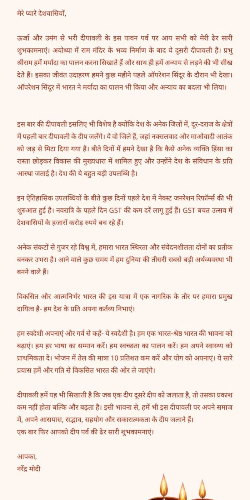 अपने पत्र के अंतिम पैरा में पीएम ने लिखा कि दीपावली हमें यह भी सिखाती है कि जब एक दीप दूसरे दीप को जलाता है, तो उसका प्रकाश कम नहीं होता बल्कि और बढ़ता है. इसी भावना से, हमें भी इस दीपावली पर अपने समाज में, अपने आसपास, सद्भाव, सहयोग और सकारात्मकता के दीप जलाने हैं.