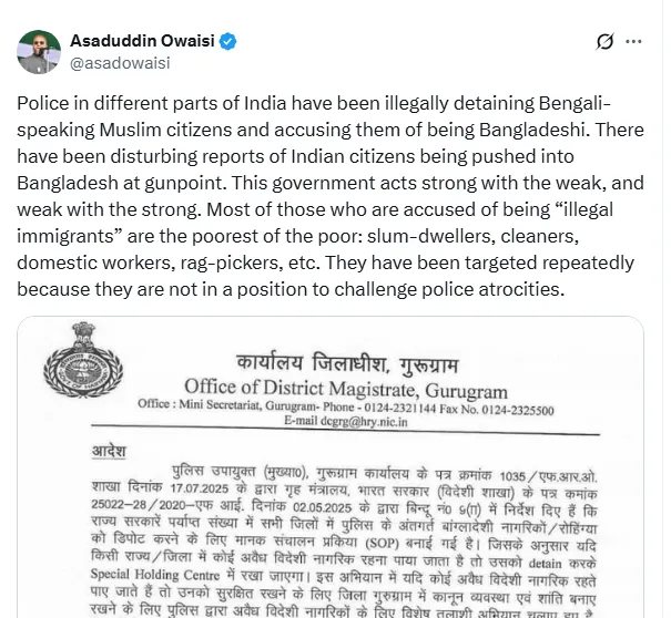 आगे ओवैसी कहते हैं, भारत के कई हिस्सों में पुलिस बंगाली भाषी मुस्लिम नागरिकों को अवैध अप्रवासी होने का आरोप लगाकर हिरासत में ले रही है. जिन लोगों पर आरोप लगाए जा रहे हैं उनमें ज्यादातर गरीब लोग हैं. वह झुग्गी-झोपड़ी में रहने वाले, सफाईकर्मी, कूड़ा बीनने वाले लोग हैं. पुलिस इन लोगों को टारगेट कर रही है क्योंकि वे गरीब हैं और पुलिस की ज्यादतियों का विरोध नहीं कर सकते हैं. उन्होंने कहा, ऐसी खबरें हैं कि भारतीय नागरिकों को बंदूक की नोक पर बांग्लादेश धकेला जा रहा है.