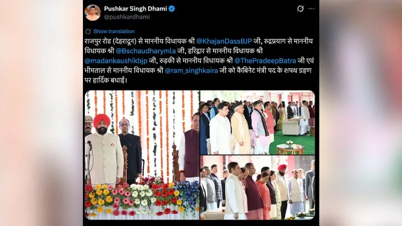 मुख्यमंत्री पुष्कर सिंह धामी ने सोशल मीडिया प्लेटफॉर्म 'एक्स' पर पोस्ट कर सभी नए कैबिनेट मंत्रियों को बधाई और शुभकामनाएं दी. उन्होंने विधायक विधायक खजान दास, भरत सिंह चौधरी, मदन कौशिक, राम सिंह केड़ा और प्रदीप बत्रा को शुभकामनाएं दीं.