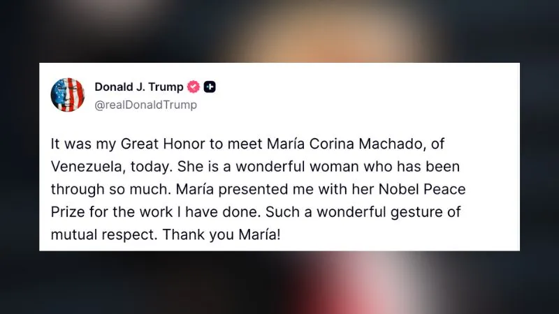 ट्रंप ने अपने सोशल मीडिया प्लेटफॉर्म 'ट्रुथ सोशल' (Truth Social) पर एक पोस्ट में मचाडो से भेंट और नोबेल मिलने की पुष्टि की. उन्होंने इसे वंडरफुल करार दिया. उन्होंने मचाडो की तारीफ करते हुए उन्हें एक अद्भुत महिला करार दिया औ कहा कि उन्होंने अपनी जिंदगी में, संघर्ष के दौरान "बहुत कुछ झेला है." ट्रंप ने लिखा, "मारिया ने मेरे द्वारा किए गए कार्यों के लिए मुझे अपना नोबेल शांति पुरस्कार भेंट किया...धन्यवाद मारिया!"