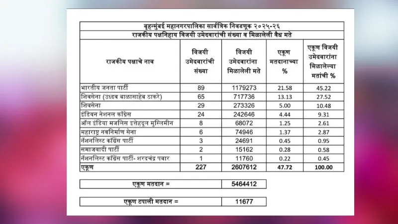 आपको बता दें कि मुंबई के सभी 227 वार्डों के चुनाव परिणाम घोषित कर दिए गए हैं. बीजेपी ने अविश्वसनीय प्रदर्शन करते हुए 89 सीटें जीती हैं. वहीं उसकी सहयोगी शिवसेना के खाते में 29 सीटें गई हैं. उद्धव की शिवसेना (यूबीटी) को 65 और MNS को छह सीटें मिली हैं.