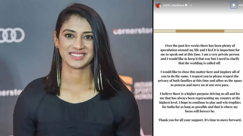 वहीं, क्रिकेटर स्मृति मंधाना ने भी इंस्टाग्राम स्टोरी पर पोस्ट किया और लिखा, ''पिछले कुछ हफ्तों से मेरी जिंदगी को लेकर बहुत सारी अटकलें लगाई जा रही हैं और मुझे लगता है कि इस समय मेरे लिए खुलकर बोलना जरूरी है. मैं बहुत निजी जीवन जीने वाली इंसान हूं और मैं इसे इस तरह ही रखना चाहूंगी, लेकिन मुझे यह स्पष्ट करना होगा कि शादी कैंसिल हो गई है.''