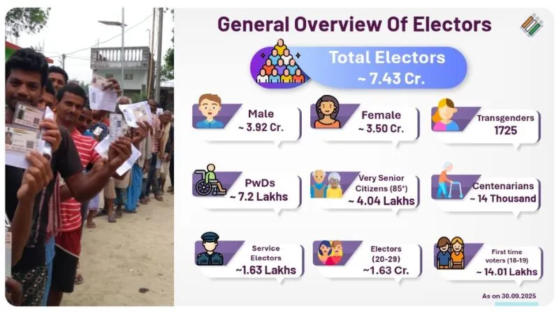 2025 के विधानसभा चुनाव इस पूर्वी राज्य में विशेष गहन पुनरीक्षण (एसआईआर) के तहत मतदाता सूची के शुद्धिकरण के बाद होने वाले पहले चुनाव होंगे, जिसके बाद 7.43 करोड़ मतदाताओं वाली अंतिम मतदाता सूची तैयार हुई, जिसमें 14 लाख पहली बार मतदान करने वाले मतदाता भी शामिल हैं.
