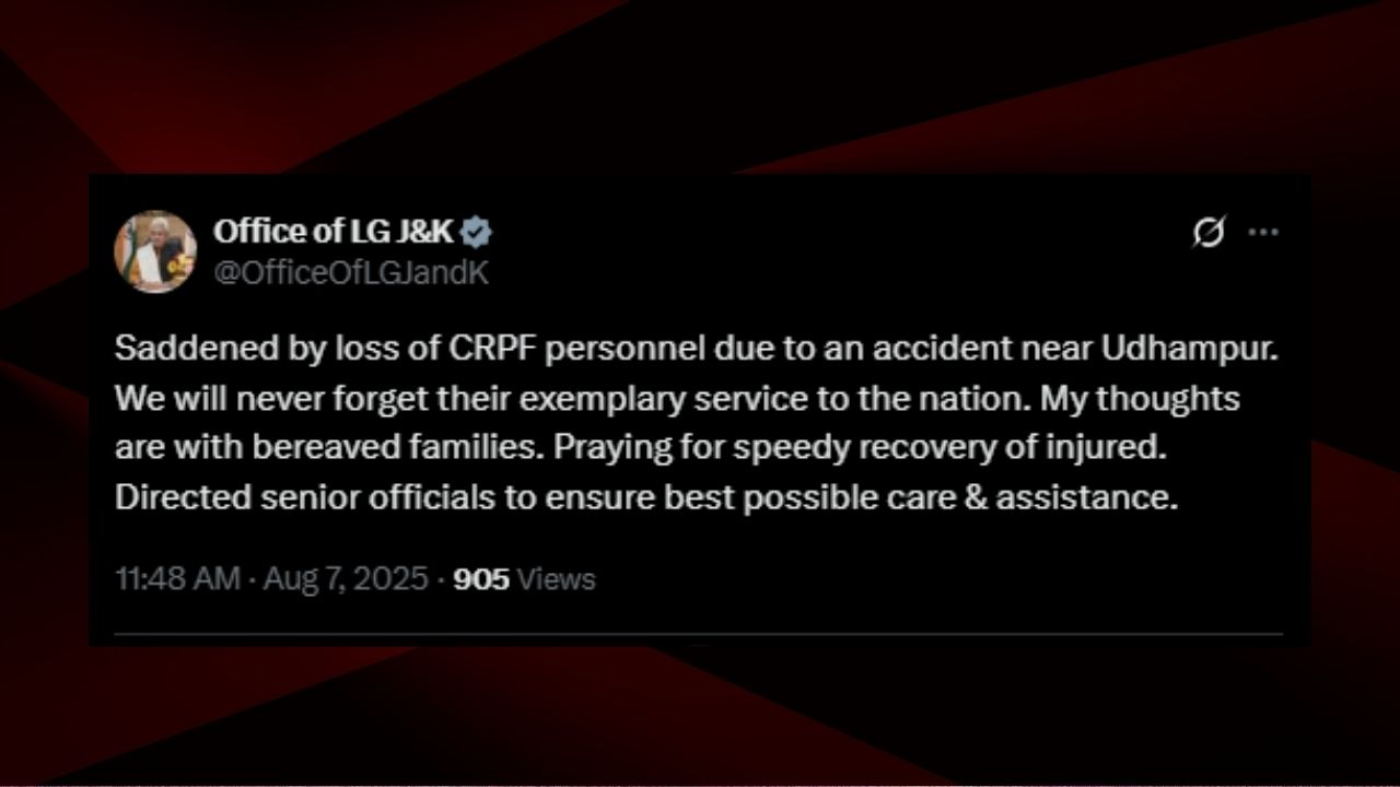 जम्मू-कश्मीर के उपराज्यपाल मनोज सिन्हा ने सोशल मीडिया प्लेटफार्म एक्स पर लिखा, “उधमपुर के पास हुए हादसे में CRPF जवानों की मौत से दुखी हूं. देश के प्रति उनकी सेवा को हम कभी नहीं भूलेंगे. शोकग्रस्त परिवारों के प्रति मेरी संवेदनाएं हैं और घायलों के जल्द ठीक होने की प्रार्थना करता हूं. अधिकारियों को बेहतर इलाज और सहायता सुनिश्चित करने के निर्देश दिए हैं.”