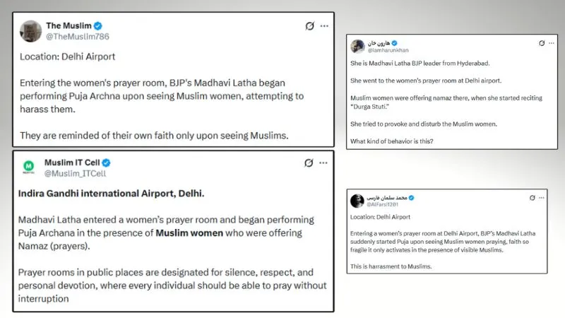 वहीं ‘मुस्लिम IT सेल’ नाम से ‘एक्स’ हैंडल ने कहा कि माधवी लता ने महिलाओं के प्रार्थना कक्ष में प्रवेश किया और नमाज अदा कर रही मुस्लिम महिलाओं की उपस्थिति में पूजा अर्चना करने लगीं. आगे लिखा कि, “सार्वजनिक स्थानों पर प्रार्थना कक्ष मौन, सम्मान और व्यक्तिगत भक्ति के लिए निर्धारित होते हैं, जहाँ प्रत्येक व्यक्ति को बिना किसी बाधा के प्रार्थना करने का अधिकार होना चाहिए.” इसके अलावा ‘हरुन खान, अल फारसी नाम के ‘एक्स’ यूजर्स ने भी इसे उकसावे और मुस्लिम उत्पीड़न से जोड़ दिया और कहा कि ये परेशान करने की कोशिश है.
