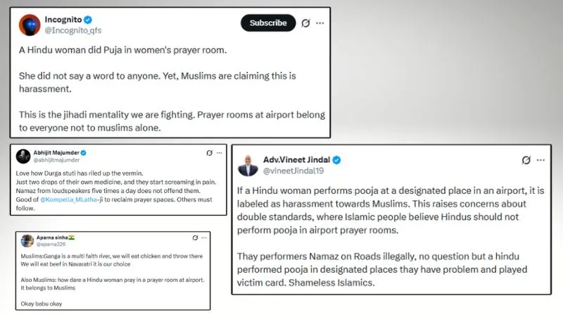 इनकॉगनिटो नाम के ‘एक्स’ यूजर ने लिखा, “उन्होंने किसी से एक शब्द भी नहीं कहा. फिर भी, मुस्लिम इसे उत्पीड़न बता रहे हैं. यही वह जिहादी मानसिकता है, जिससे हम लड़ रहे हैं. हवाई अड्डे पर नमाज पढ़ने के कमरे सभी के लिए हैं, केवल मुस्लिमों के लिए नहीं.”