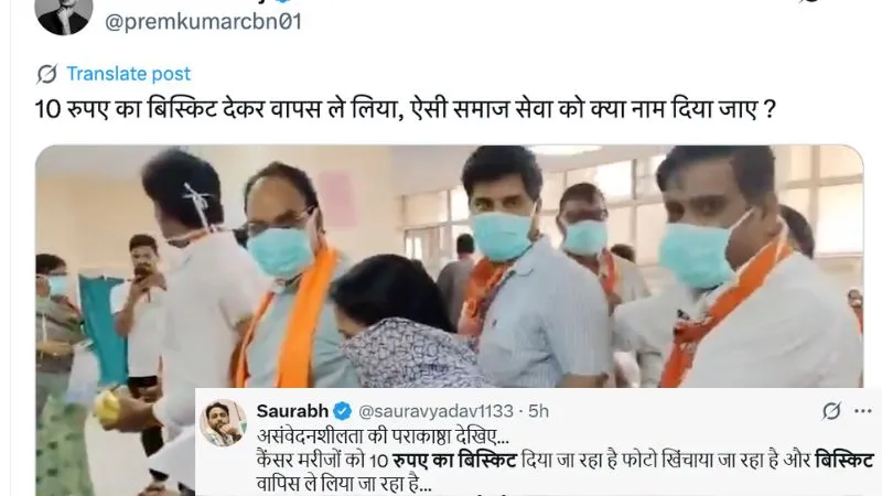 एक यूजर ने लिखा, असंवेदनशीलता की पराकाष्ठा देखिए...कैंसर मरीजों को 10 रुपए का बिस्किट दिया जा रहा है फोटो खिंचाया जा रहा है और बिस्किट वापिस ले लिया जा रहा है...किस पार्टी के कार्यकर्ता हो सकते हैं और ये नाटक किस से सीखे होंगे आप खुद समझिए...