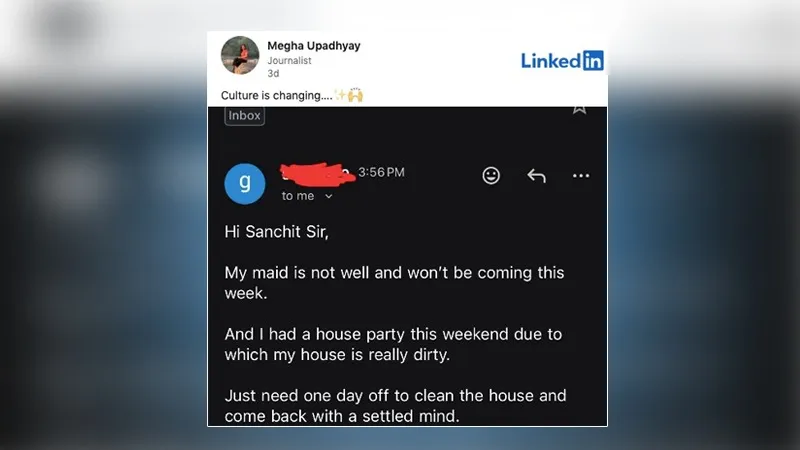 आज के समय में वर्क-लाइफ बैलेंस की अहमियत बढ़ गई है और छुट्टी लेने के कारण भी बदल रहे हैं. हाल ही में एक कर्मचारी का ईमेल वायरल हुआ, जिसमें उसने मेड के बीमार होने और घर की सफाई के लिए एक दिन की छुट्टी मांगी, जिससे बदलते वर्क कल्चर की झलक मिलती है.