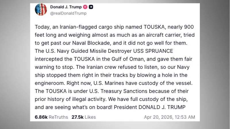 स्ट्रेट ऑफ होर्मुज में अमेरिकी नेवी ने नाकेबंदी तोड़ने की कोशिश कर रहे ईरानी झंडे वाले कार्गो ‘TOUSKA’ को ओमान की खाड़ी में इंटरसेप्ट कर कब्जे में ले लिया. ट्रंप ने दावा किया कि जहाज ने चेतावनी नजरअंदाज की थी.