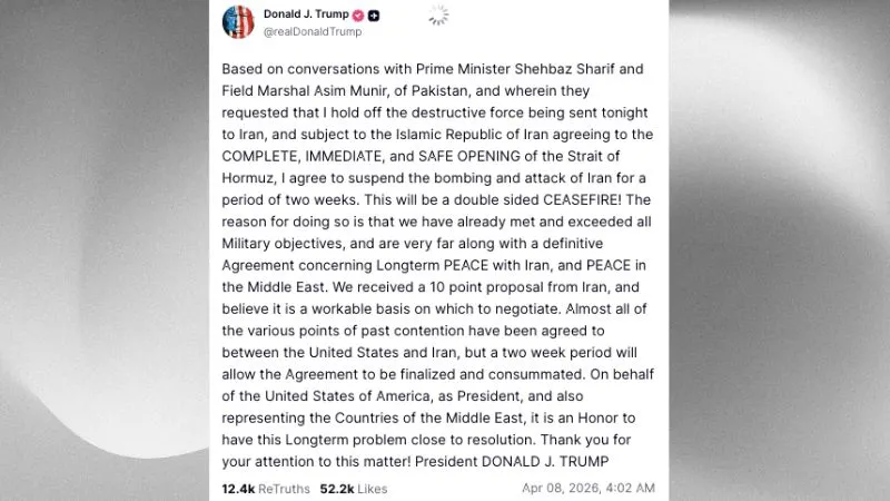 अमेरिकी राष्ट्रपति ट्रंप ने अपने सोशल मीडिया प्लेटफॉर्म ट्रुथ सोशल पर पोस्ट करते हुए साफ कहा कि वह दो हफ्तों के लिए ईरान पर बमबारी और हमलों को स्थगित करने के लिए तैयार हैं. उन्होंने इसे एक बड़े और स्थायी युद्धविराम की दिशा में पहला कदम बताया. खास बात यह रही कि यह फैसला पाकिस्तान के प्रधानमंत्री और सेना प्रमुख के साथ हुई बातचीत के बाद लिया गया. बताया जा रहा है कि अब आगे की बातचीत पाकिस्तान में होगी.