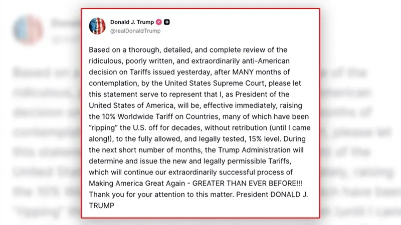 कोर्ट के फैसले के बाद को दरकिनार करते हुए अमेरिकी राष्ट्रपति ट्रंप ने एक कार्यकारी आदेश पर हस्ताक्षर कर 10% शुल्क लगा दिया. अब इसे बढ़ाकर 15% कर दिया गया है. यह कदम वैश्विक व्यापार जगत में चिंता का विषय बन गया है क्योंकि अमेरिका के प्रमुख व्यापारिक साझेदारों को अब अनिश्चितता का सामना करना पड़ रहा है.