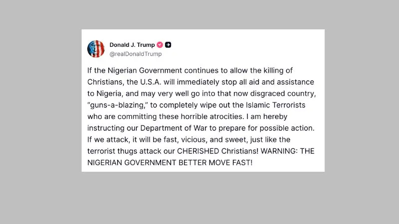 ट्रंप ने अपने पोस्ट में लिखा, "अगर नाइजीरियाई सरकार ईसाइयों की हत्या की अनुमति देना जारी रखती है, तो अमेरिका तुरंत नाइजीरिया को दिए जाने वाले सभी सहायता को बंद कर देगा, और इन भयानक अत्याचारों को अंजाम देने वाले इस्लामी आतंकवादियों को पूरी तरह से खत्म करने के लिए गोली उगलते बंदूकों को उस बदनाम देश में भेजा जा सकता है."