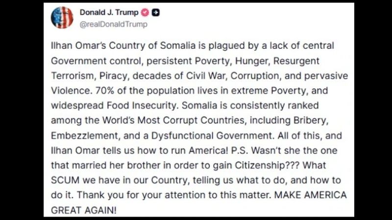अब अपने ताजा पोस्ट में ट्रंप ने इल्हान उमर को लंबा-चौड़ा लेक्चर दिया है. ट्रंप ने ट्रूथ सोशल पर एक पोस्ट में कहा है, "इल्हान उमर का देश सोमालिया सरकार के नियंत्रण की कमी, लगातार गरीबी, भुखमरी, फिर से उभरते आतंकवाद, समुद्री डकैती, दशकों से चल रहे गृहयुद्ध, भ्रष्टाचार और व्यापक हिंसा से त्रस्त है. 70% आबादी घोर गरीबी और व्यापक खाद्य असुरक्षा में जी रही है. रिश्वतखोरी, गबन और एक निकम्मी सरकार के कारण सोमालिया को लगातार दुनिया के सबसे भ्रष्ट देशों में गिना जाता है."